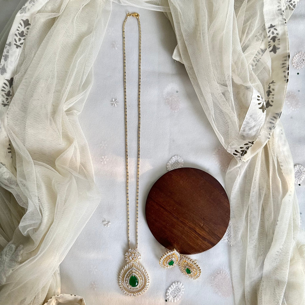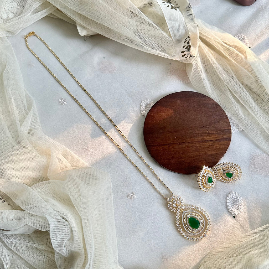 Green CZ tear drop floral pendant set